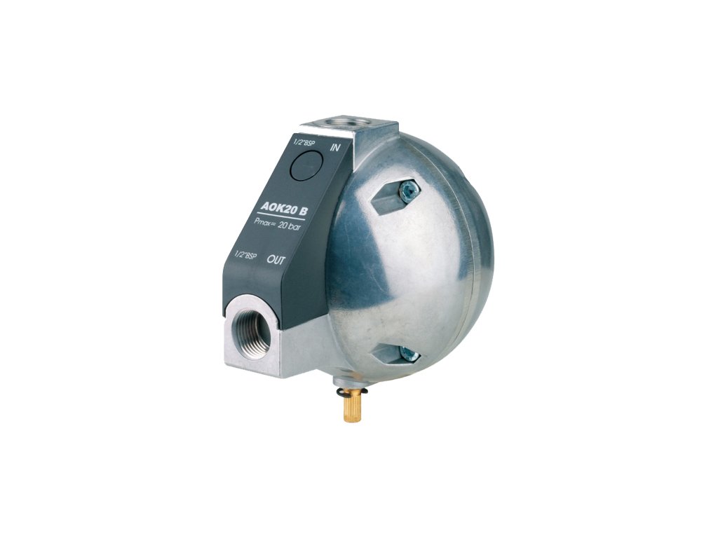 Kondenzát se hromadí v hliníkové nádrži a pokud je hladina dostatečně vysoká, kondenzát se vypouští ze systému bez ztráty vzduchu. Ventil s přímým účinkem je provozován přesně řízeným plovákem, který zajišťuje spolehlivý a efektivní provoz. Díky robustnímu hliníkovému pouzdru je AOK 20B vhodný pro náročné aplikace.