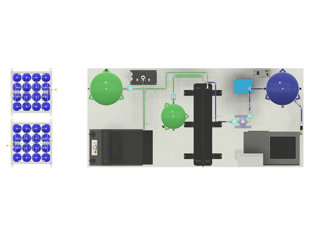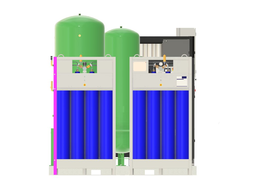 - Kompaktní, plug-and-play konstrukce – všechny komponenty (kompresor s proměnnou rychlostí otáček, generátor dusíku typu PSA, sušička vzduchu, filtry, booster kompresor a zásobníky) jsou namontované na jedné rámové platformě, což zkracuje dobu instalace, minimalizuje potřebný prostor a umožňuje rychlý start.