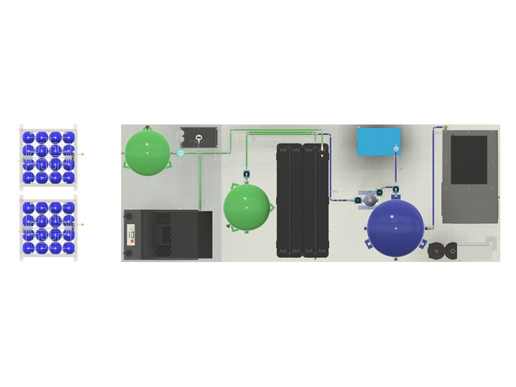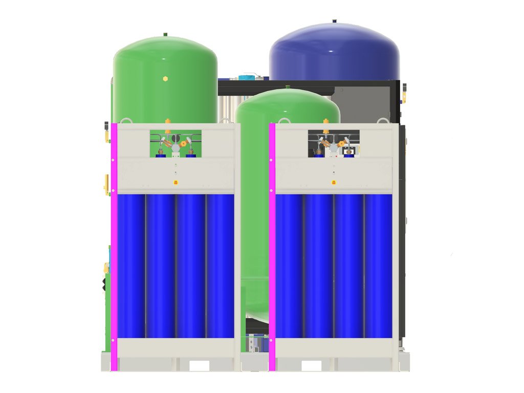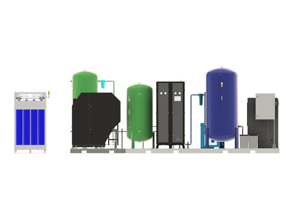 - Kompaktní, plug-and-play konstrukce – všechny komponenty (kompresor s proměnnou rychlostí otáček, generátor dusíku typu PSA, sušička vzduchu, filtry, booster kompresor a zásobníky) jsou namontované na jedné rámové platformě, což zkracuje dobu instalace, minimalizuje potřebný prostor a umožňuje rychlý start.
