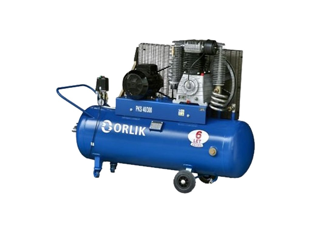 Pístový kompresor Orlík PKS 40/270 olejový, průmyslový, dvouválcový, dvoustupňový, pomaloběžný, pohon na klínové řemeny, výkon výtlačný 40 m3/hod, 667 l/min, provozní tlak 6,5-9,0 bar, max. tlak 10 bar, ležatý vzdušník s kolečky o objemu 270 litrů, na výstupu instalován kulový kohout G3/4". Součástí kompresoru je tlakový spínač včetně proudové ochrany.