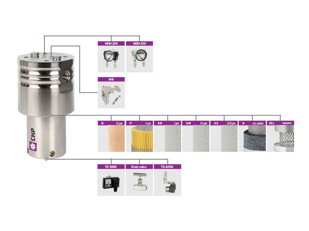 Vysokotlaké filtry CHP z uhlíkové oceli jsou navrženy pro vysoce účinné odstraňování pevných částic, vody, olejových aerosolů, uhlovodíků a dalších par z vysokotlakých systémů stlačeného vzduchu do 420 barů. Požadované kvality stlačeného vzduchu dle normy ISO 8571-1 lze dosáhnout pomocí 6 různých tříd filtračních prvků (B, P, R, M, S a A). Pro efektivní odvod kondenzátu z tělesa filtru by měl být použit volitelný externí odtok kondenzátu.