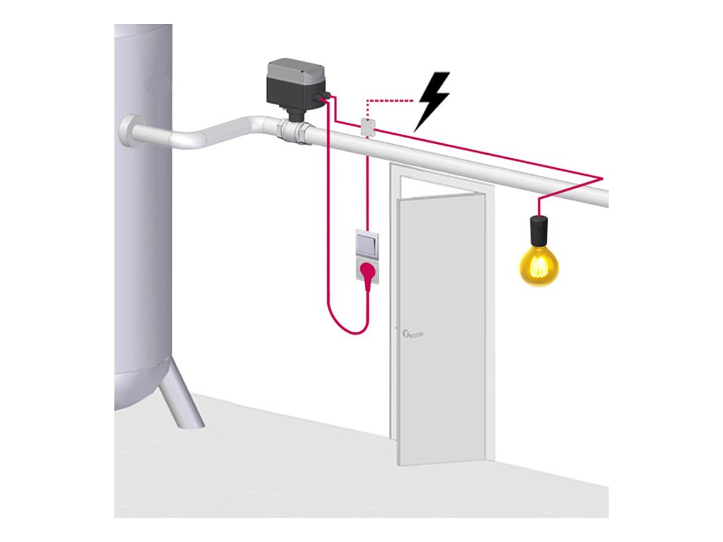 Typickým příkladem instalace je připojení AIR-SAVER-LS k vypínači (viz. obrázek) - rozsvícením světel ve výrobním prostoru se ventil následně otevře. Uložený stlačený vzduch proudí do továrního potrubí stlačeného vzduchu a kompresor se spustí, aby vyrobil vzduch potřebný k naplnění systému. Na konci pracovní směny vypnete světlo a ventil se odpovídajícím způsobem zavře.